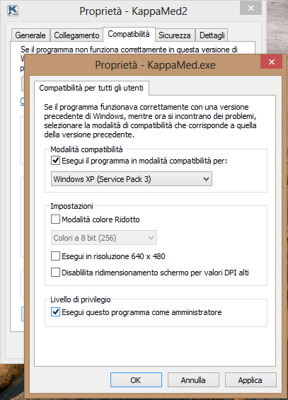 Di seguito vengono ripotate le schermate guida per la gestione della compatibilità l'operazione va ripetuta sia per 'KappaMed2' che per 'Aggiornamento KappaMed' che per 'Servizi'.